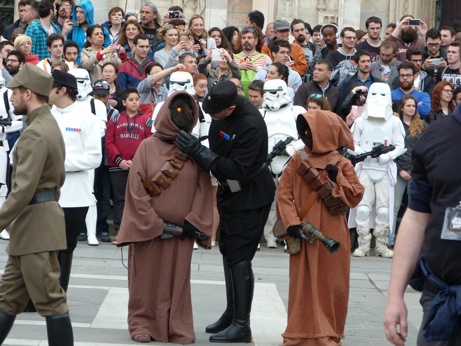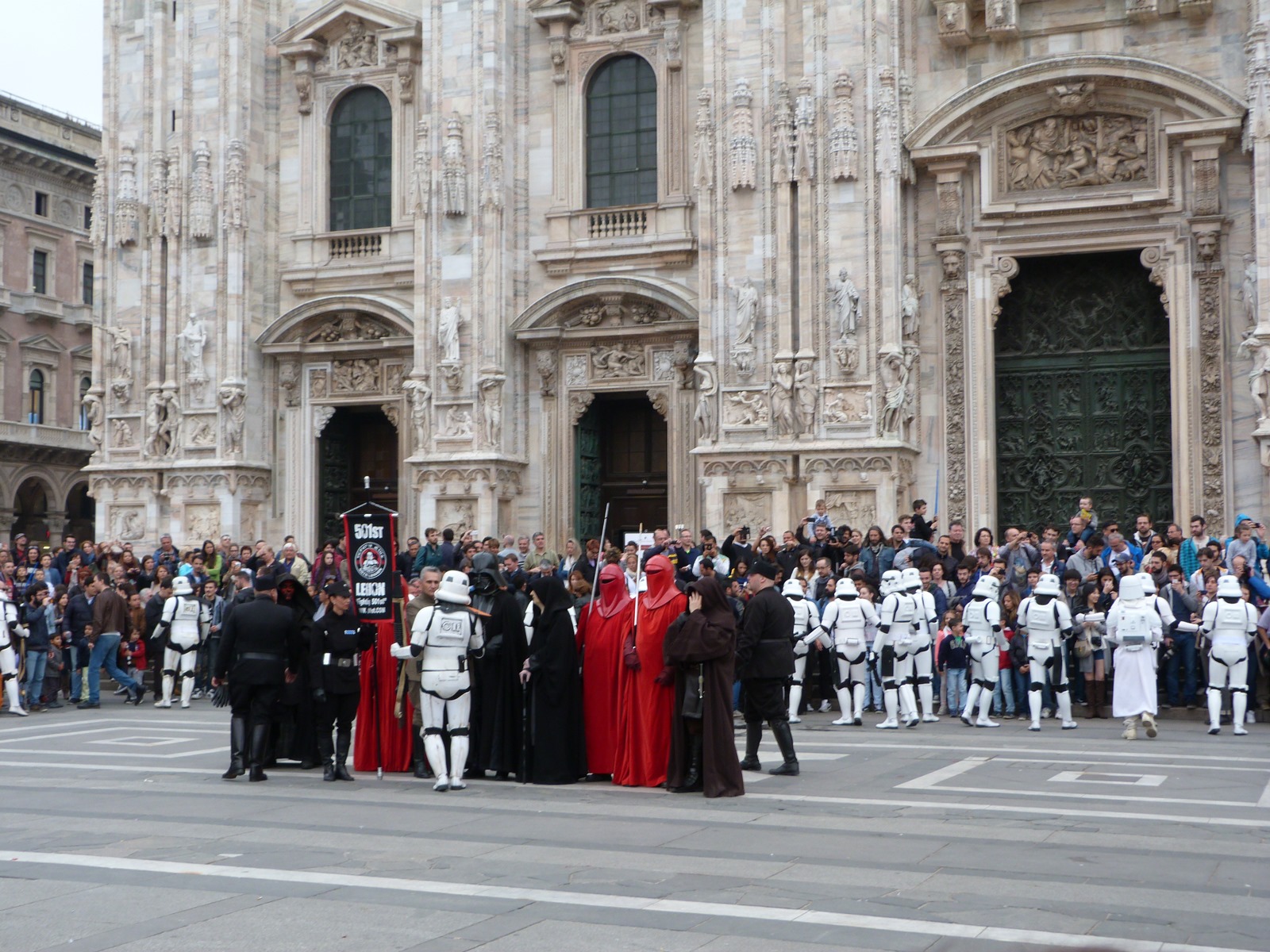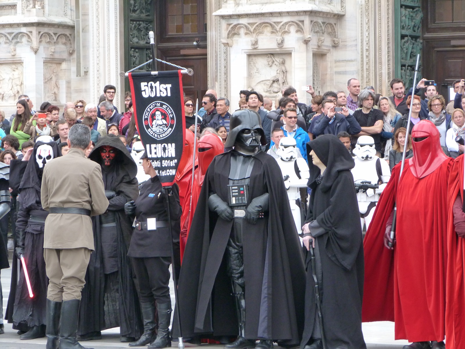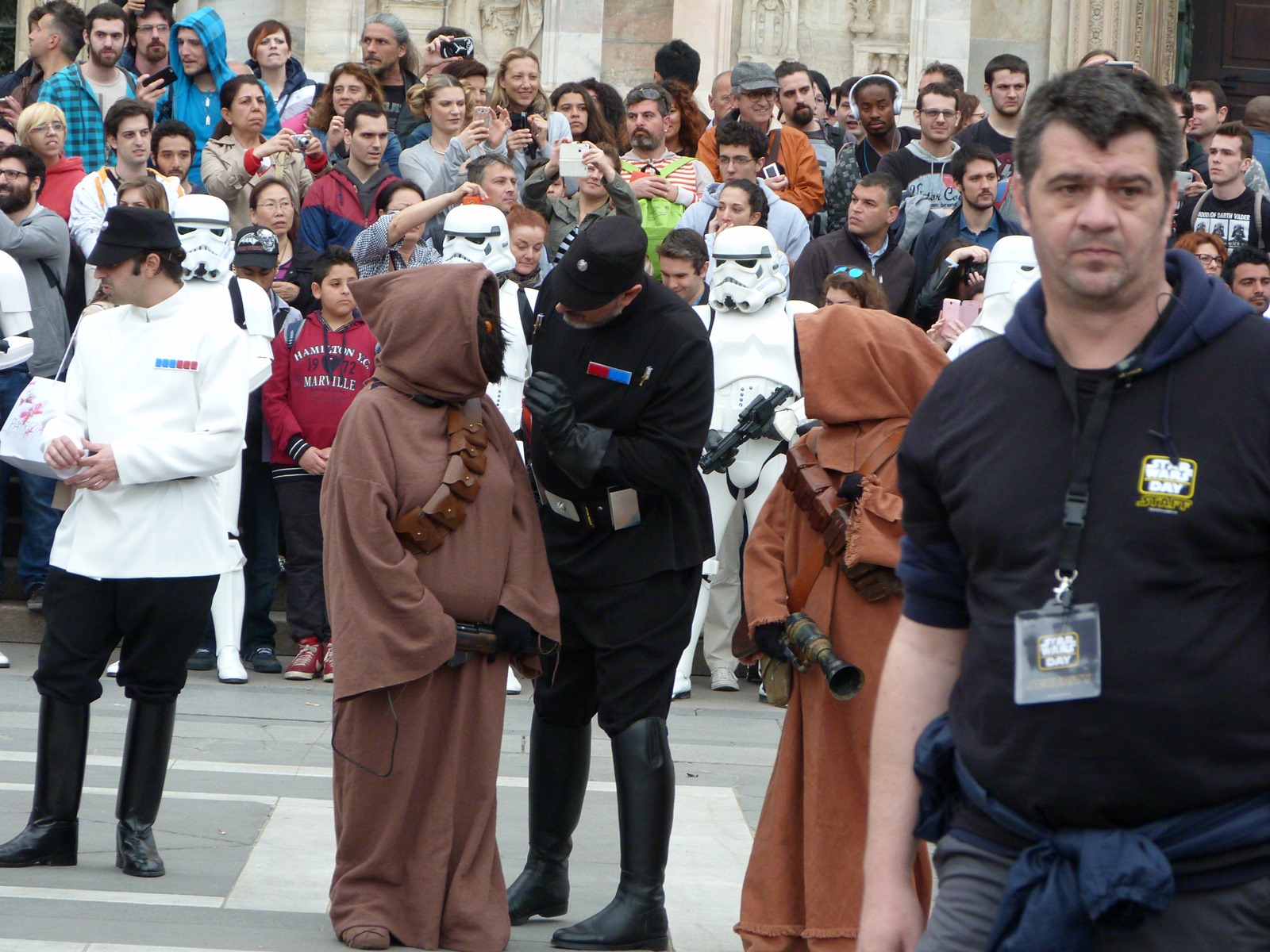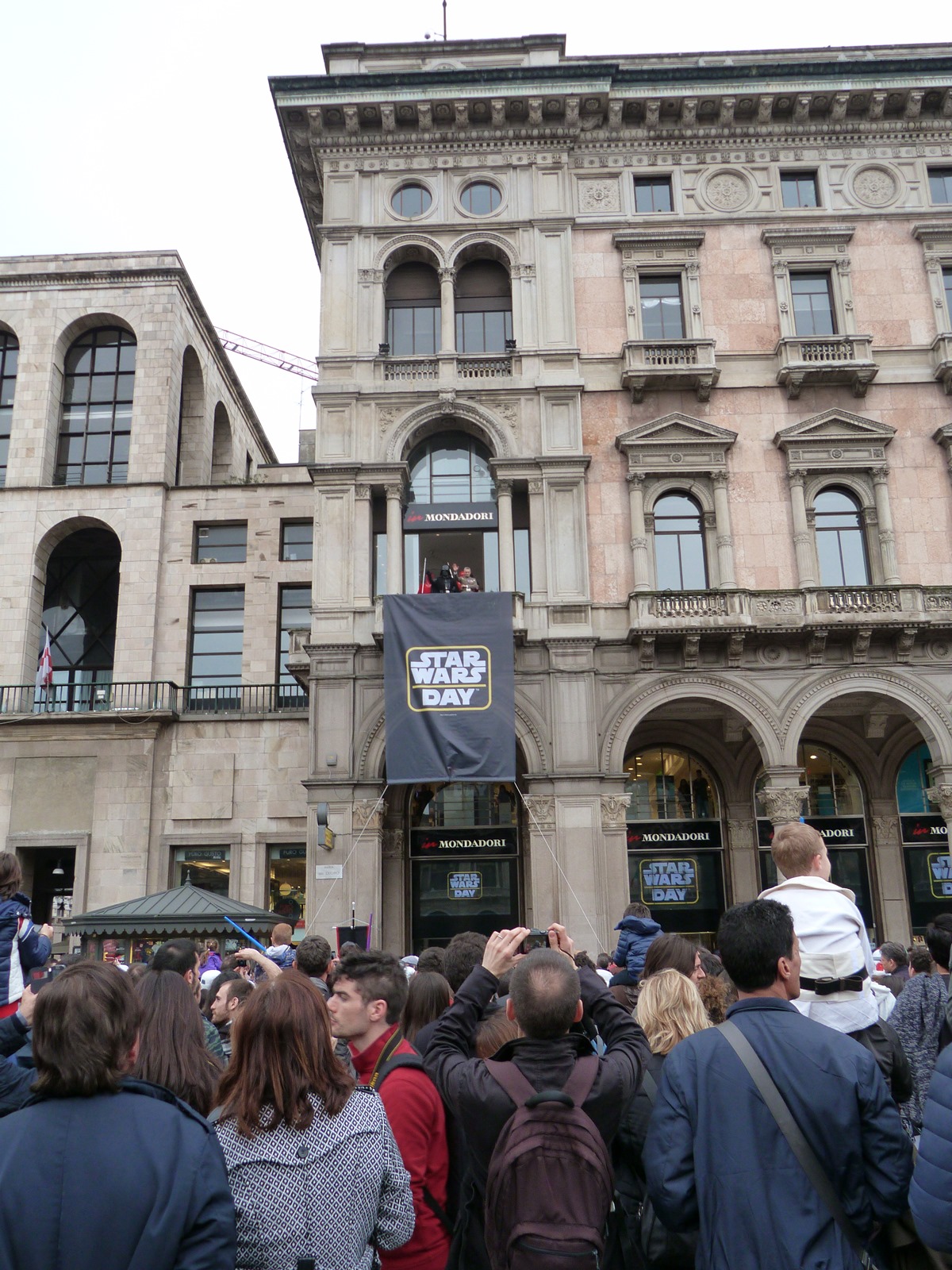 All'arrivo in piazza Duomo erano già innumerevoli i fan di tutte le età in attesa di vedere da vicino i propri personaggi preferiti e le prime spade laser si facevano già intravedere in mano a tanti bambini, ma non solo, mentre gli stormtrooper attendevano l'apparizione dalla Terrazza Mondadori di Darth Vader che ha salutato dall'alto.