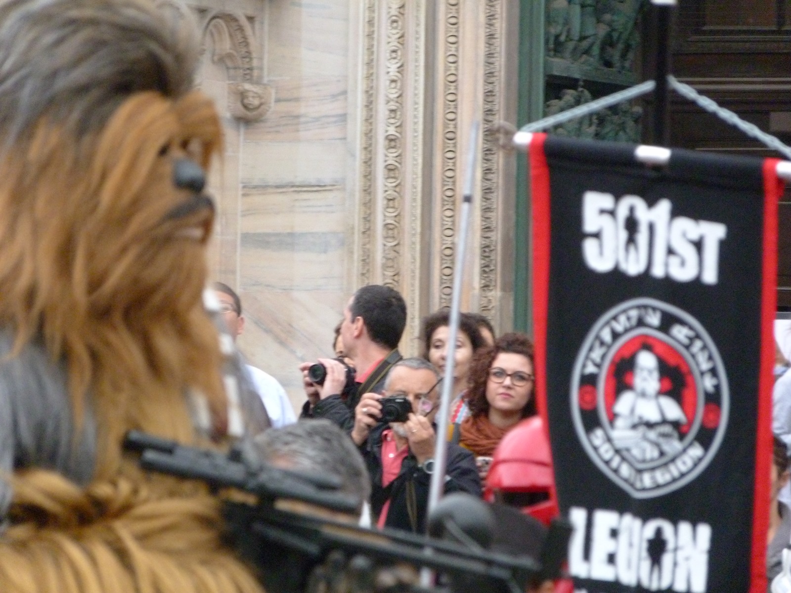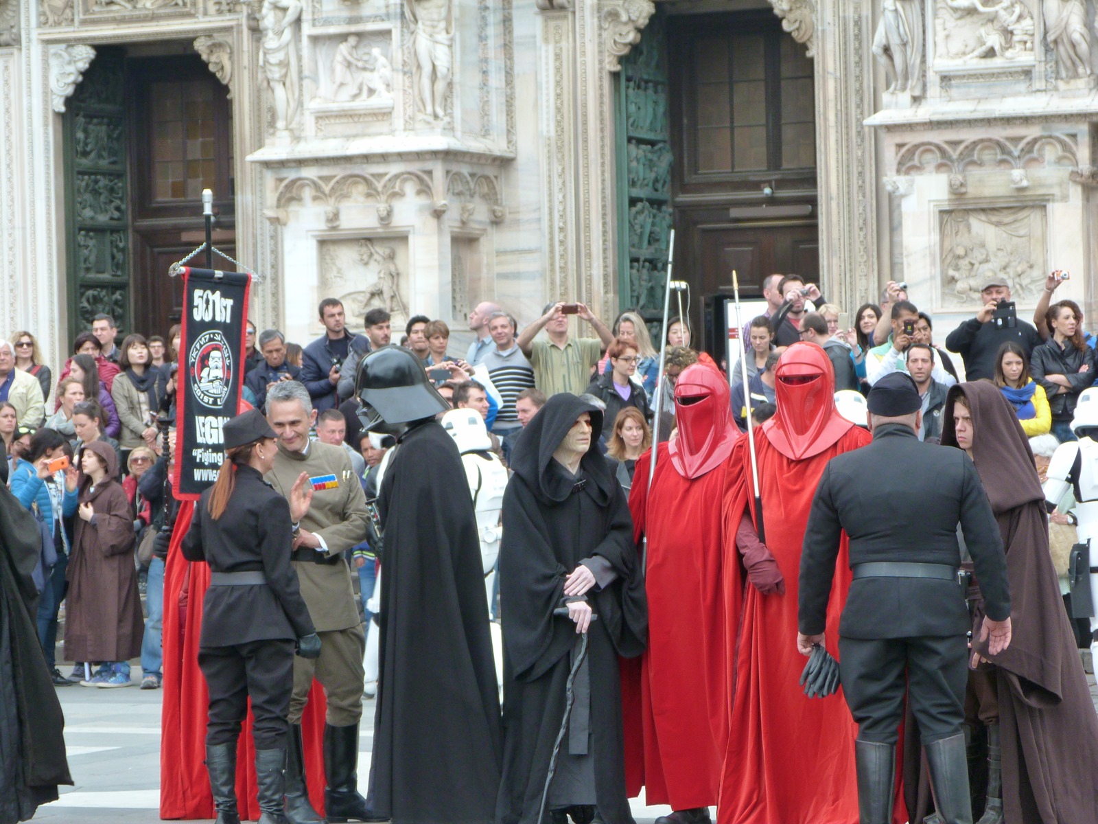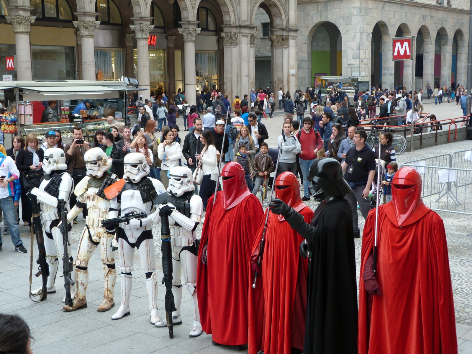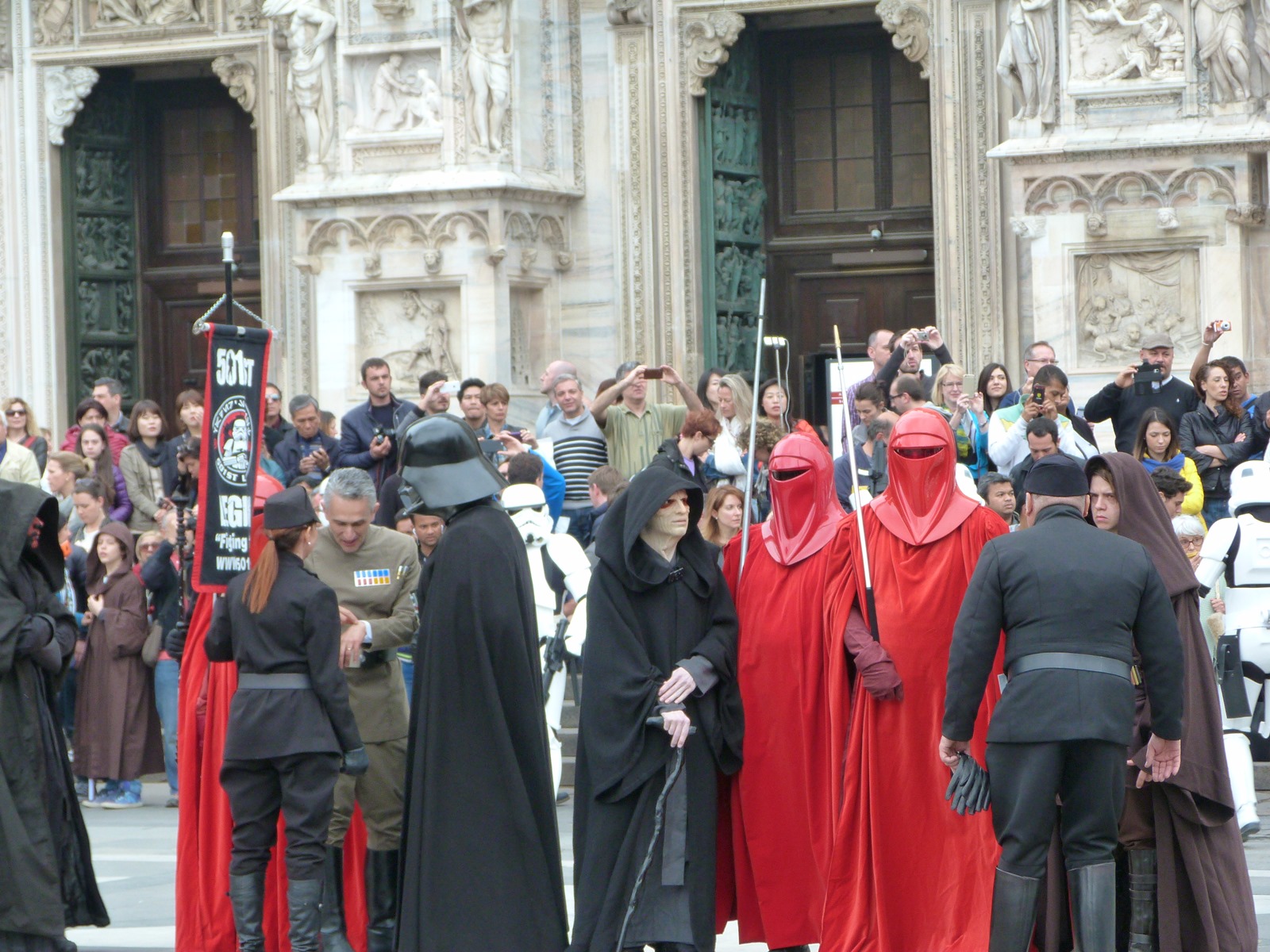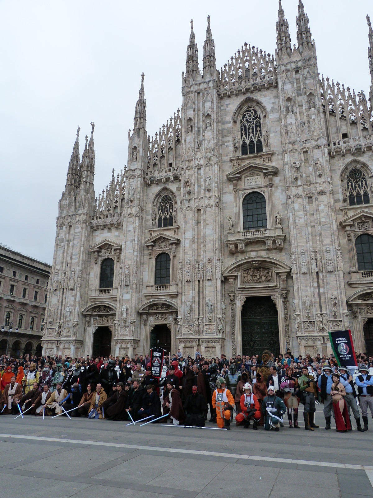 All'arrivo in piazza Duomo erano già innumerevoli i fan di tutte le età in attesa di vedere da vicino i propri personaggi preferiti e le prime spade laser si facevano già intravedere in mano a tanti bambini, ma non solo, mentre gli stormtrooper attendevano l'apparizione dalla Terrazza Mondadori di Darth Vader che ha salutato dall'alto.