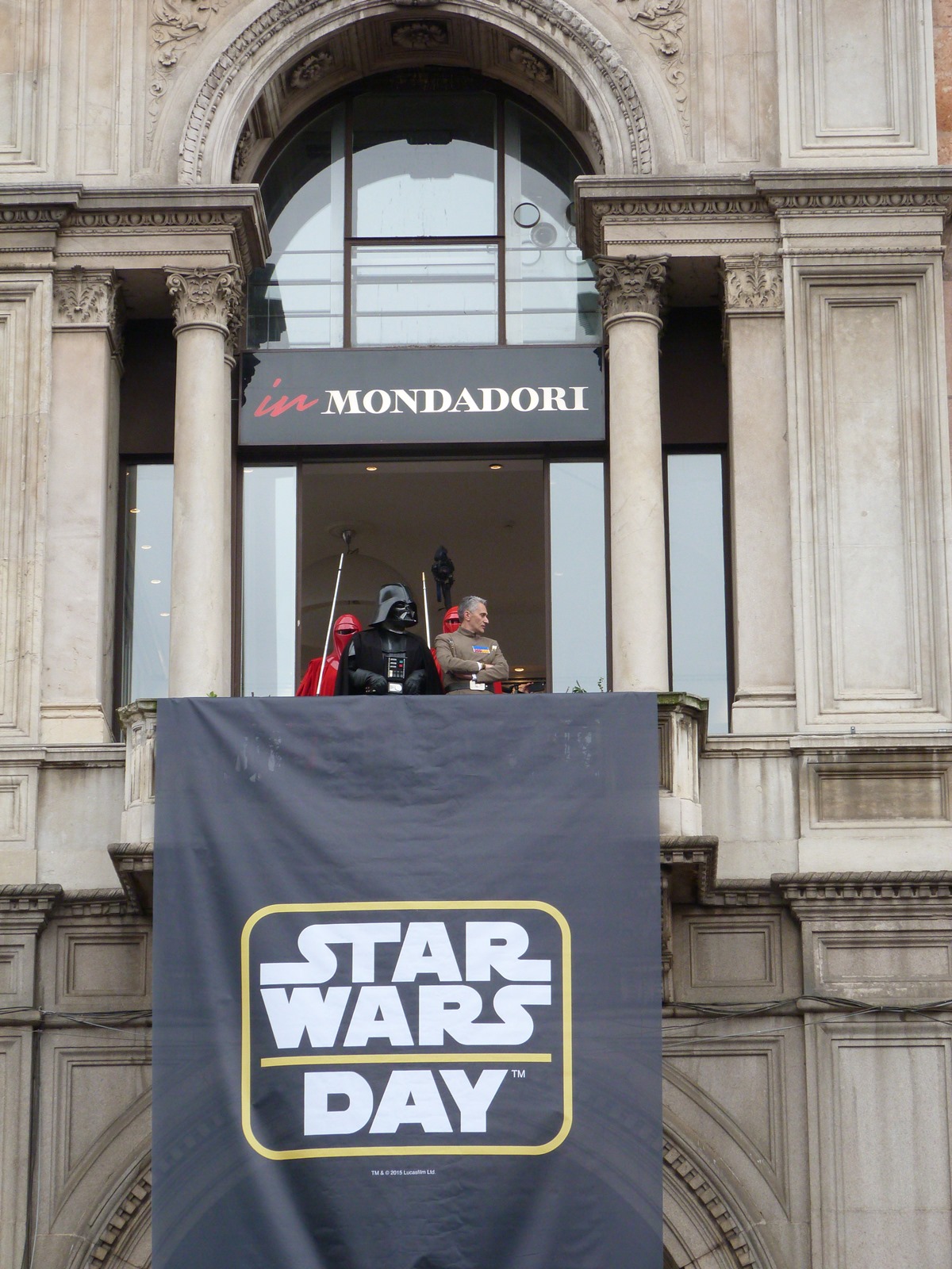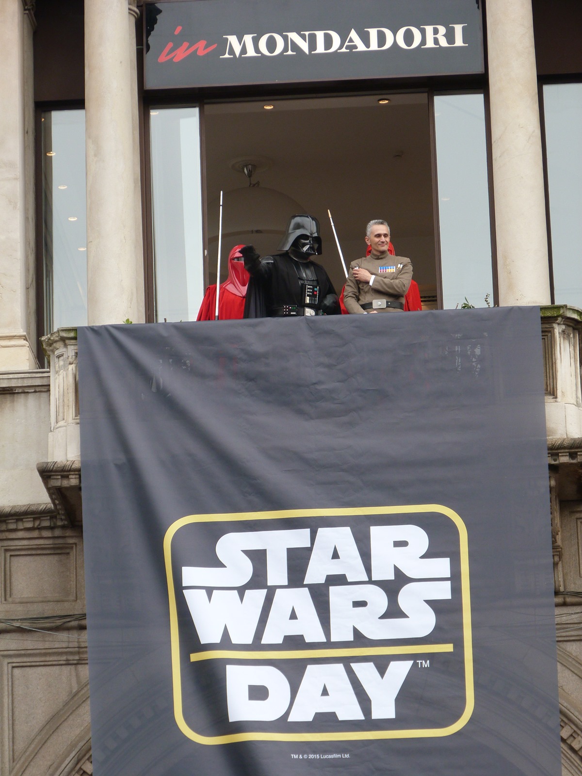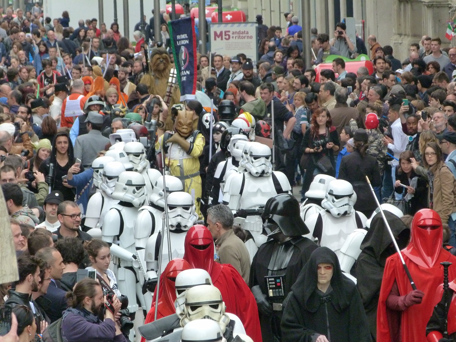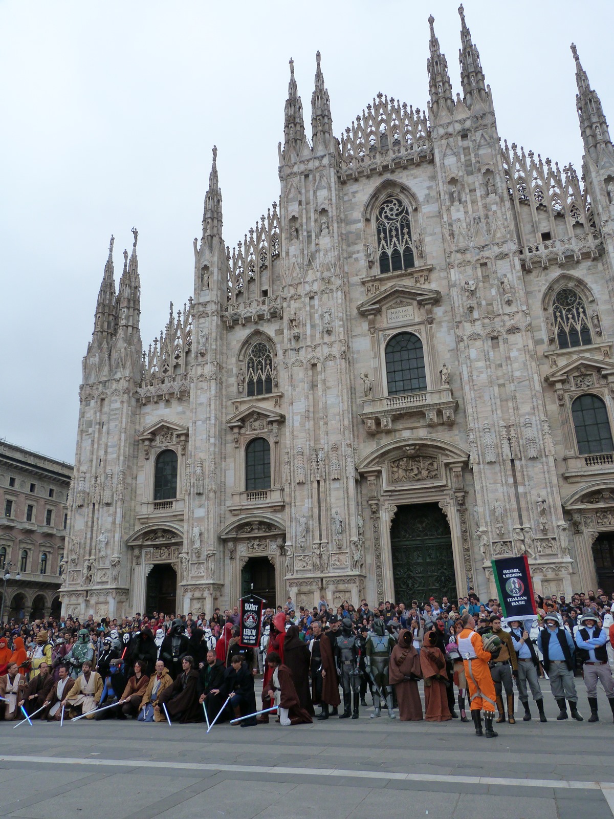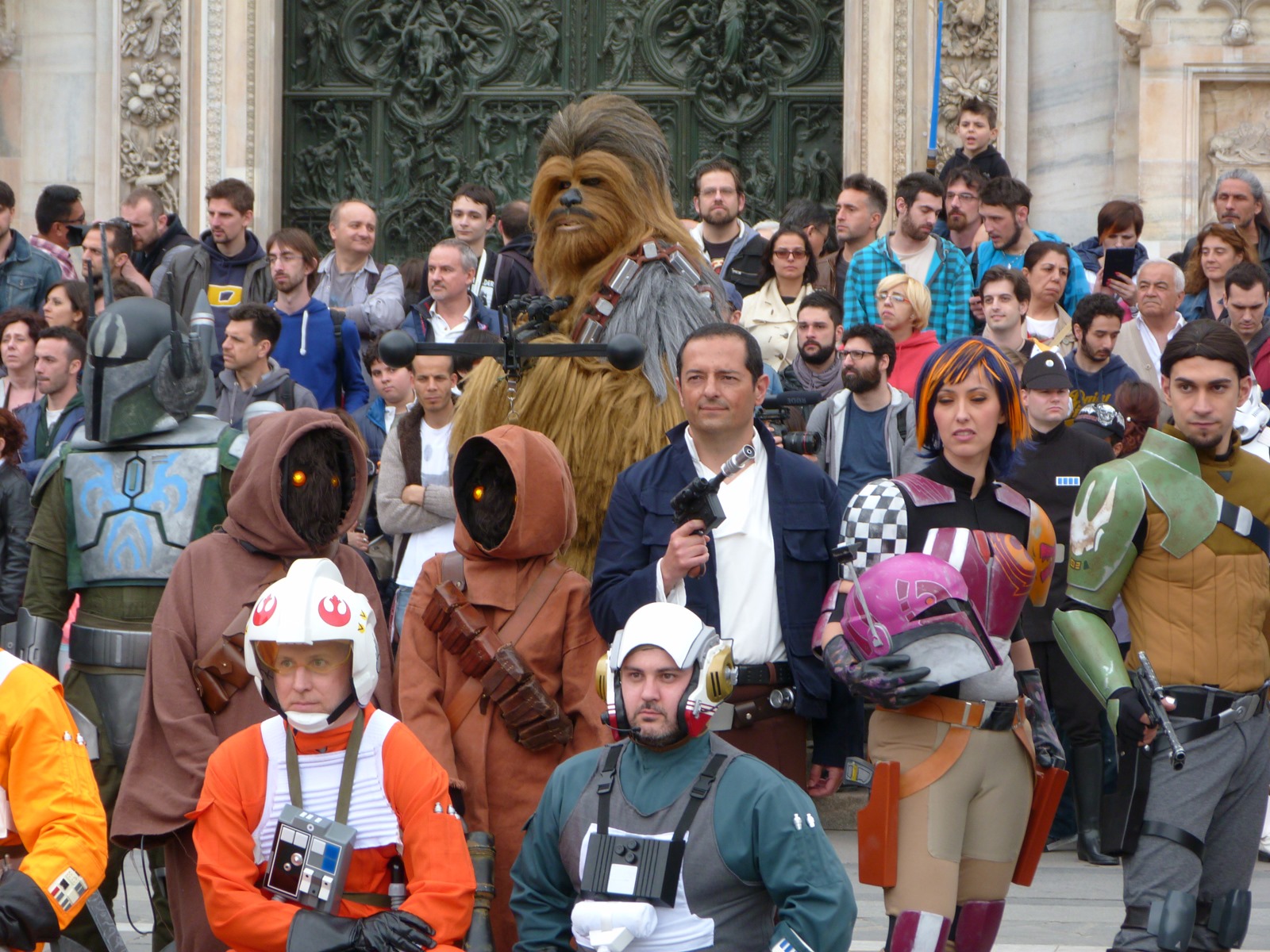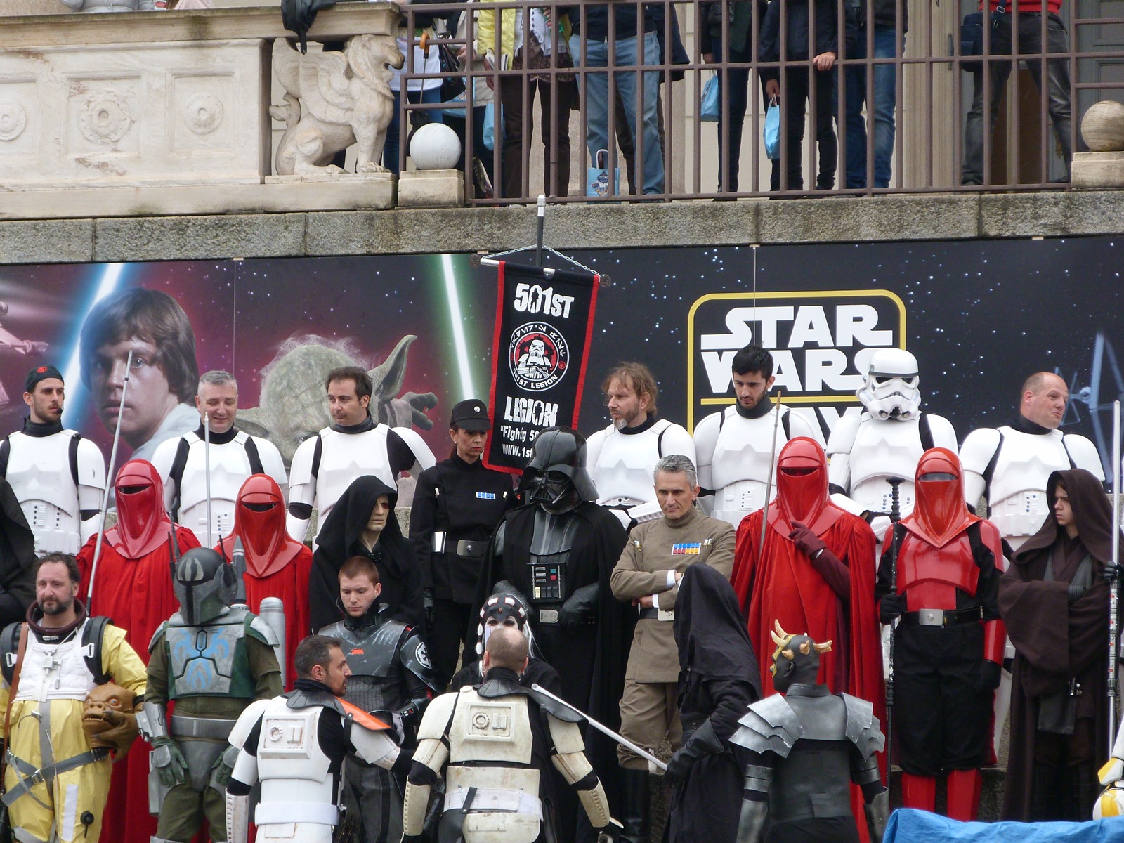 All'arrivo in piazza Duomo erano già innumerevoli i fan di tutte le età in attesa di vedere da vicino i propri personaggi preferiti e le prime spade laser si facevano già intravedere in mano a tanti bambini, ma non solo, mentre gli stormtrooper attendevano l'apparizione dalla Terrazza Mondadori di Darth Vader che ha salutato dall'alto.