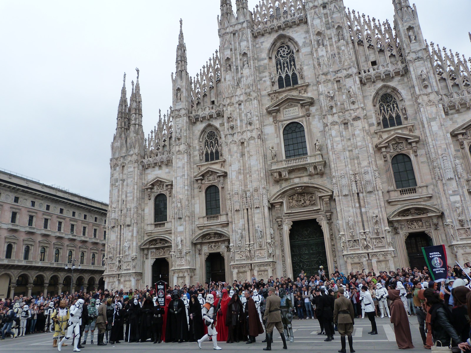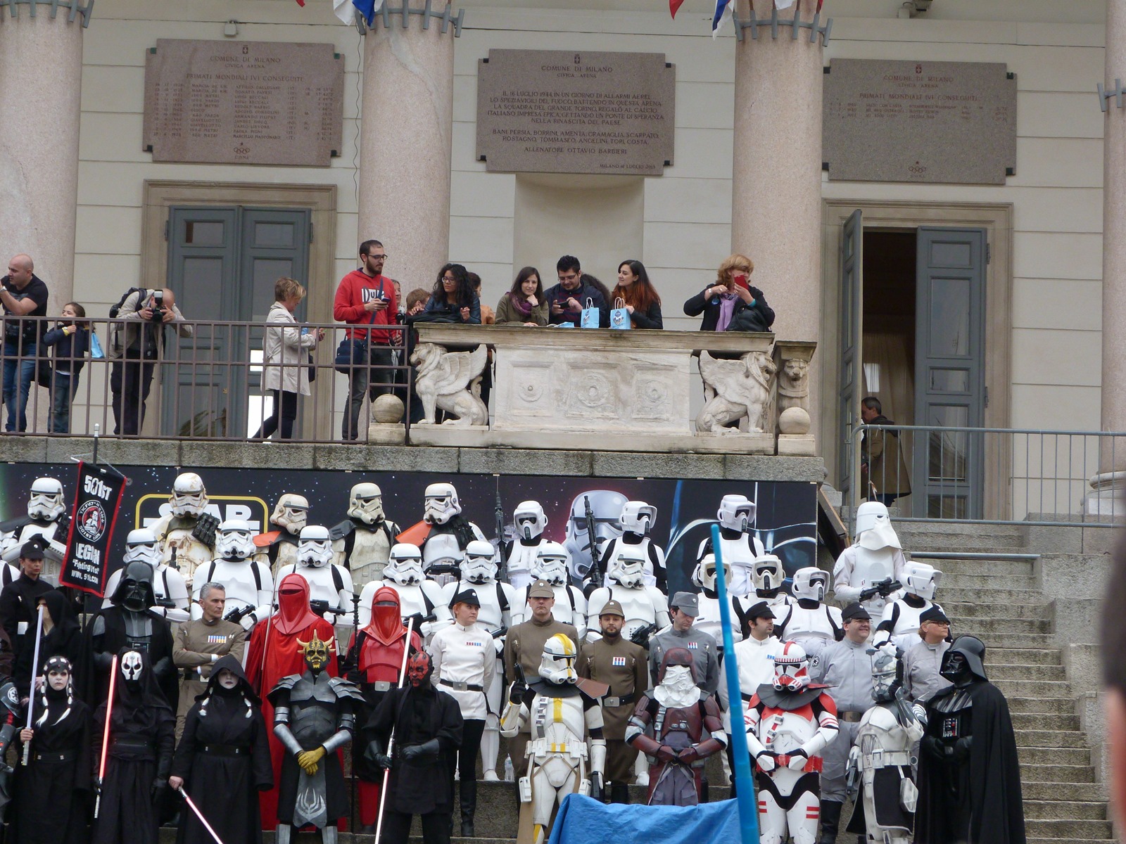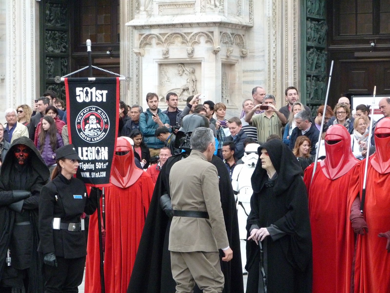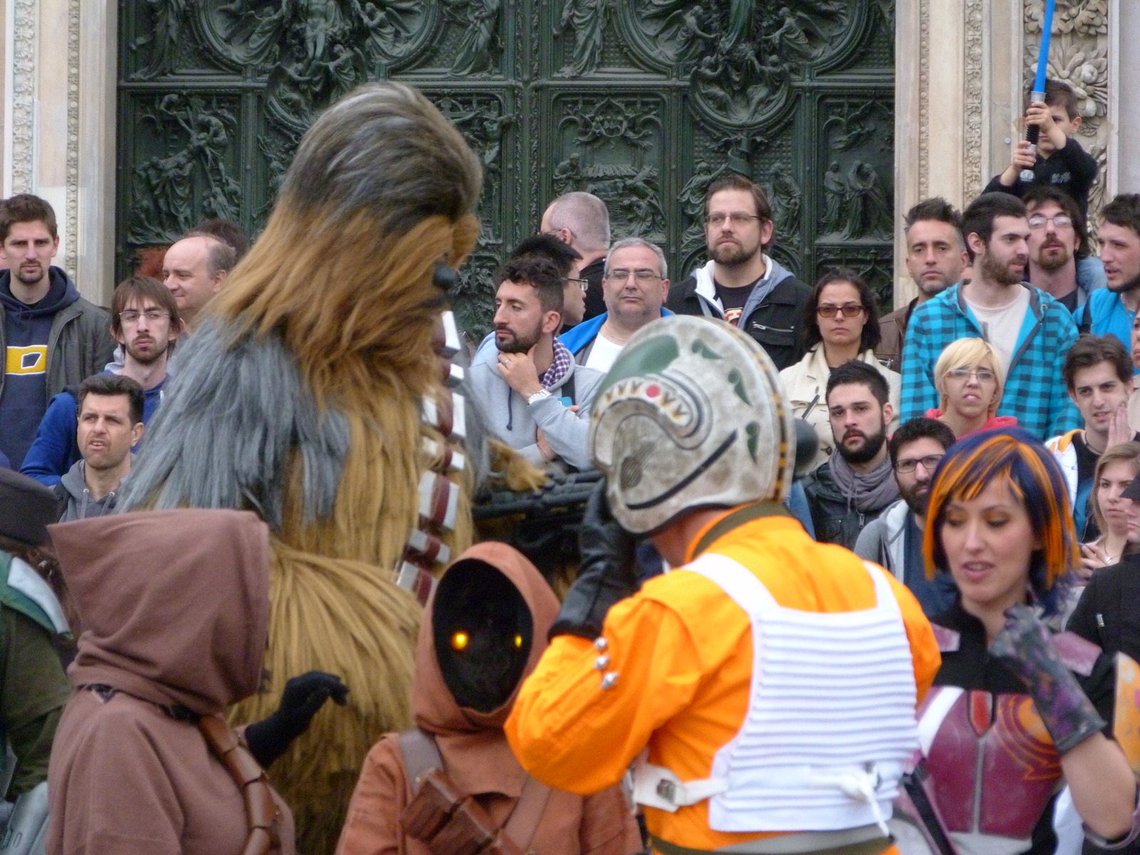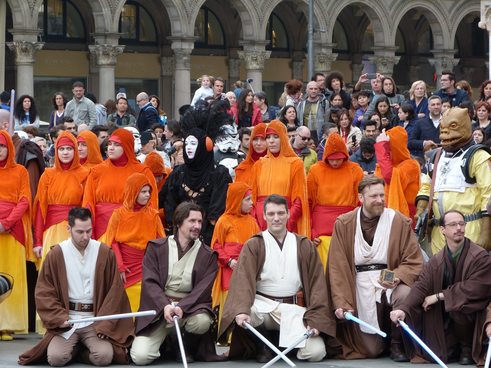 All'arrivo in piazza Duomo erano già innumerevoli i fan di tutte le età in attesa di vedere da vicino i propri personaggi preferiti e le prime spade laser si facevano già intravedere in mano a tanti bambini, ma non solo, mentre gli stormtrooper attendevano l'apparizione dalla Terrazza Mondadori di Darth Vader che ha salutato dall'alto.