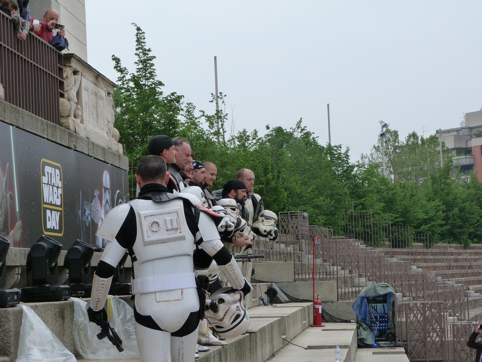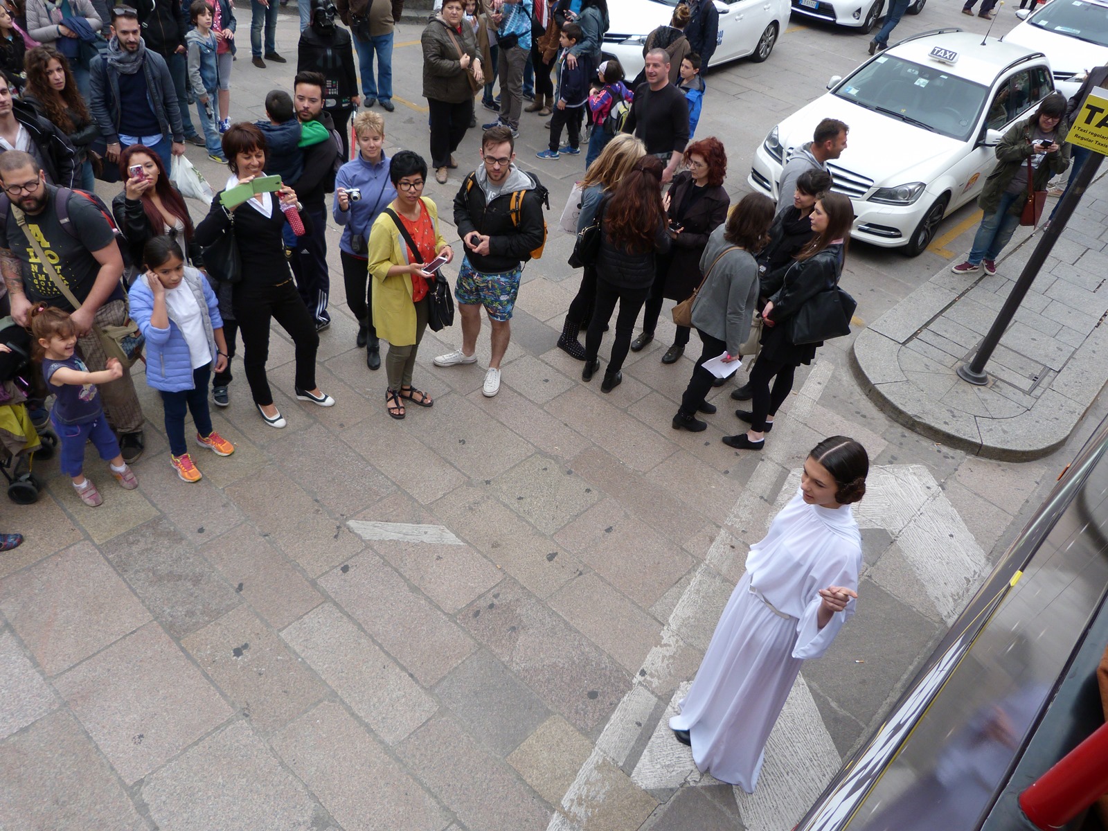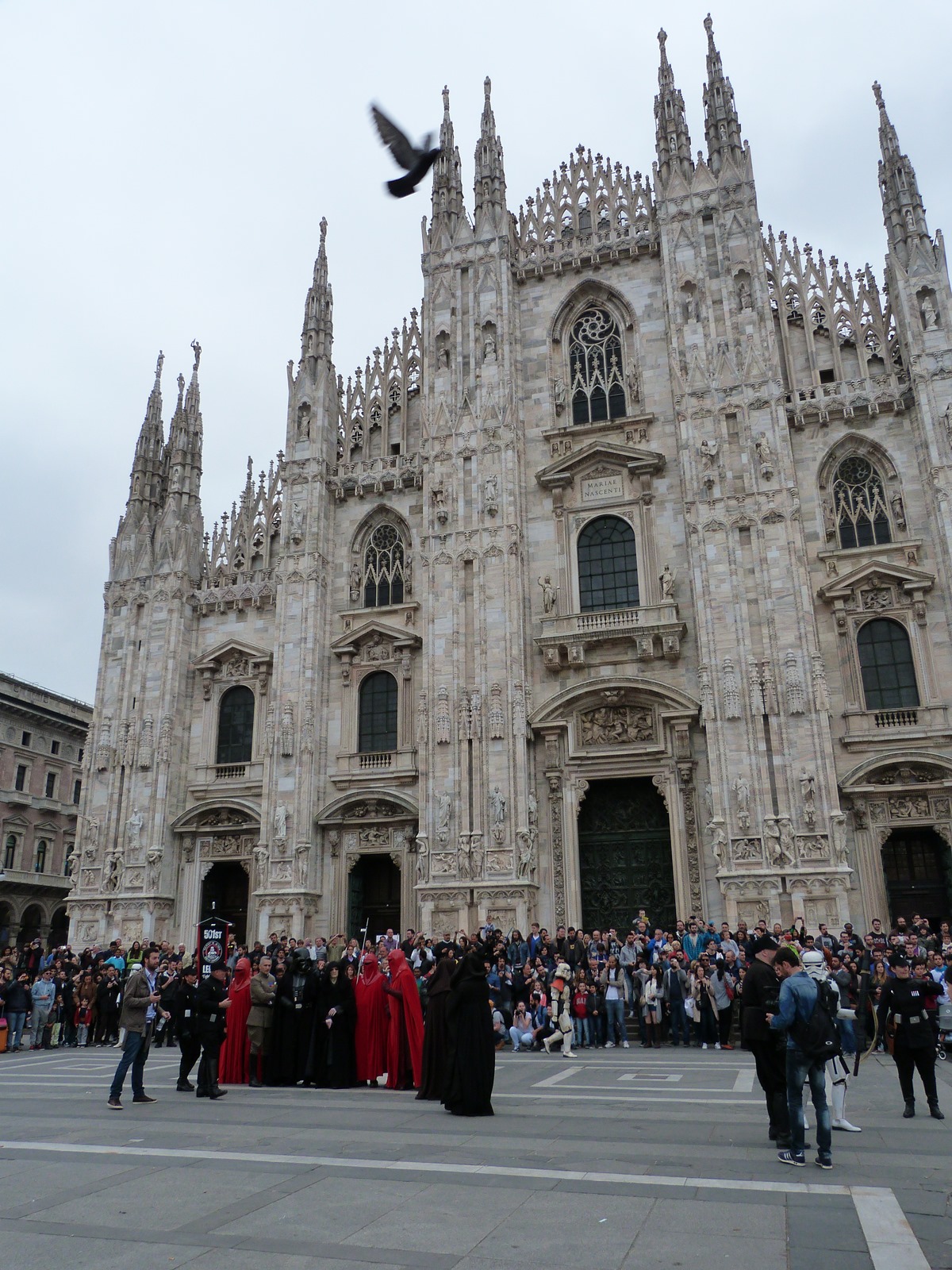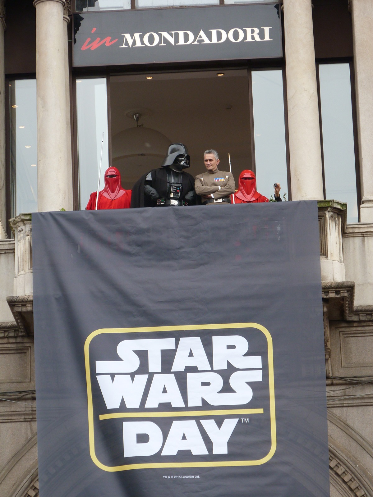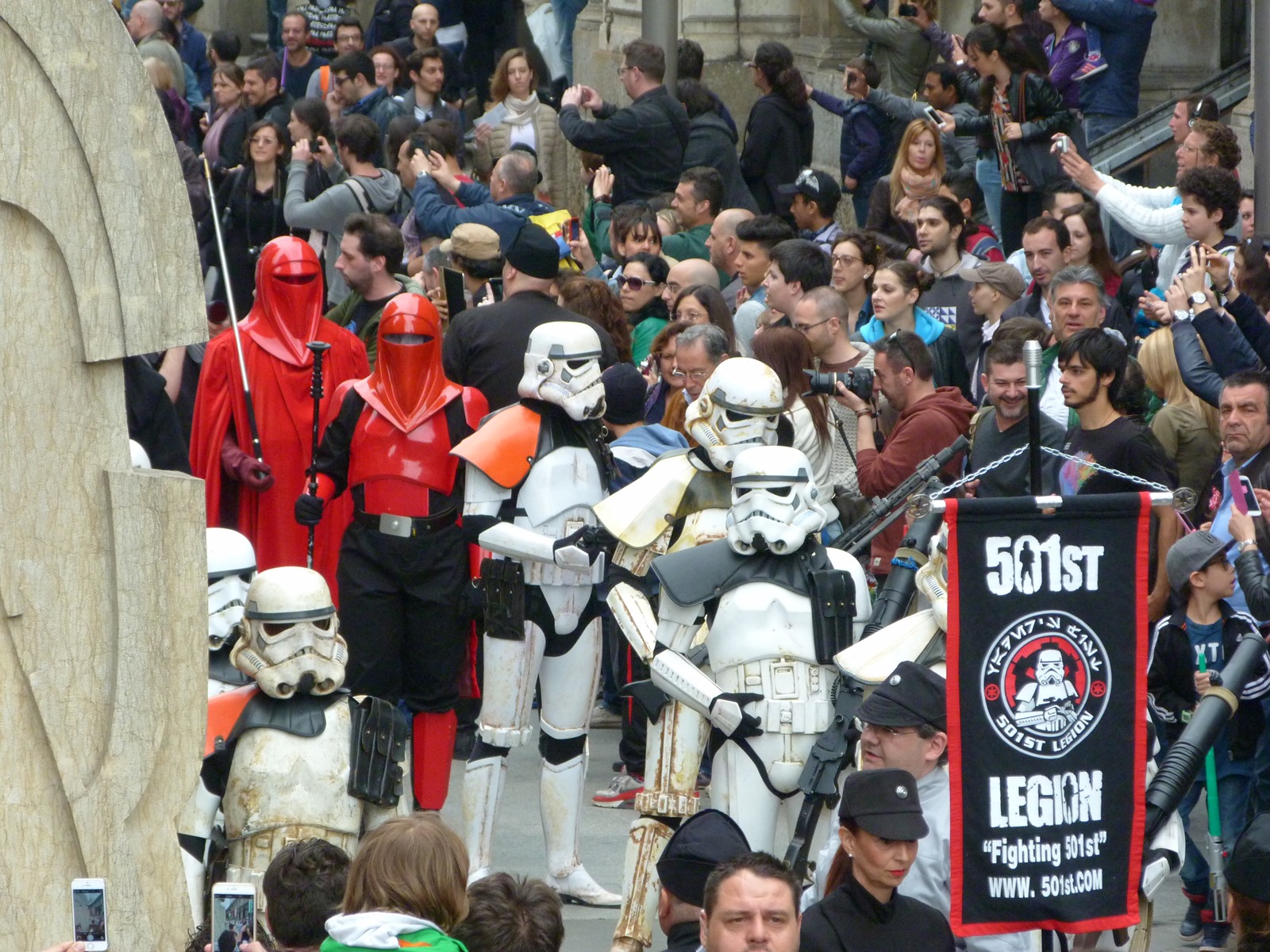 All'arrivo in piazza Duomo erano già innumerevoli i fan di tutte le età in attesa di vedere da vicino i propri personaggi preferiti e le prime spade laser si facevano già intravedere in mano a tanti bambini, ma non solo, mentre gli stormtrooper attendevano l'apparizione dalla Terrazza Mondadori di Darth Vader che ha salutato dall'alto.