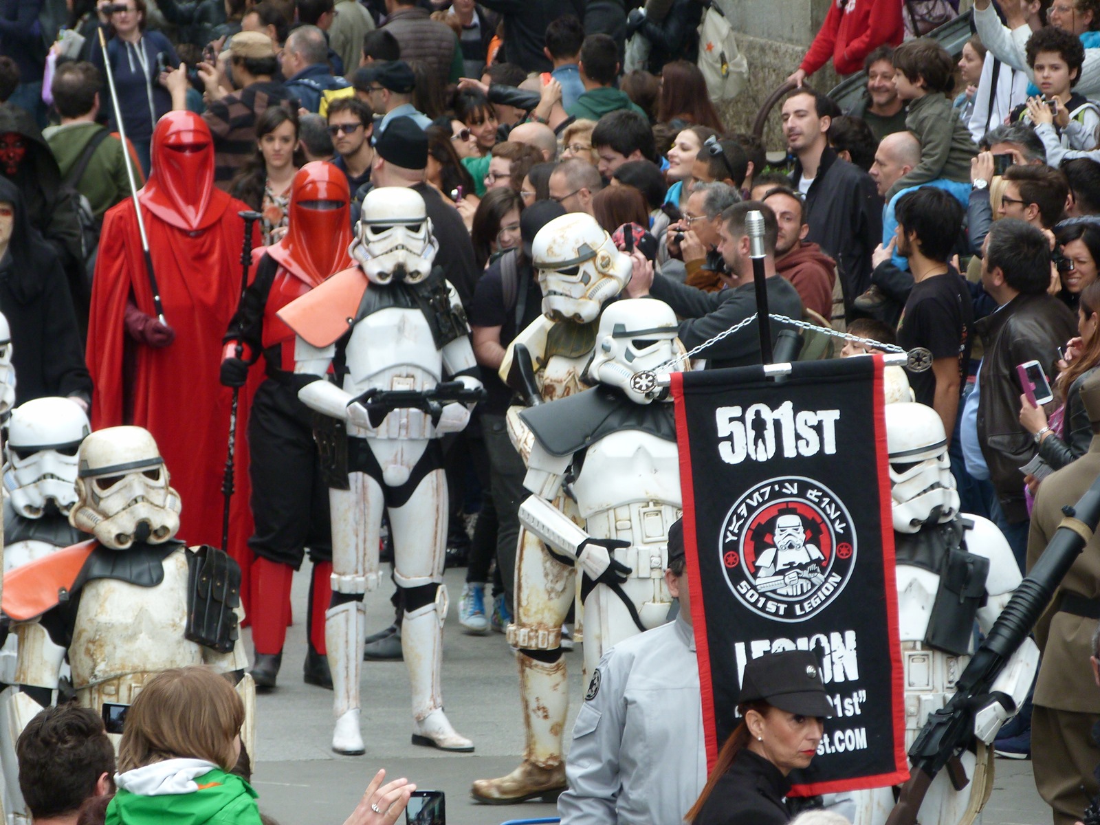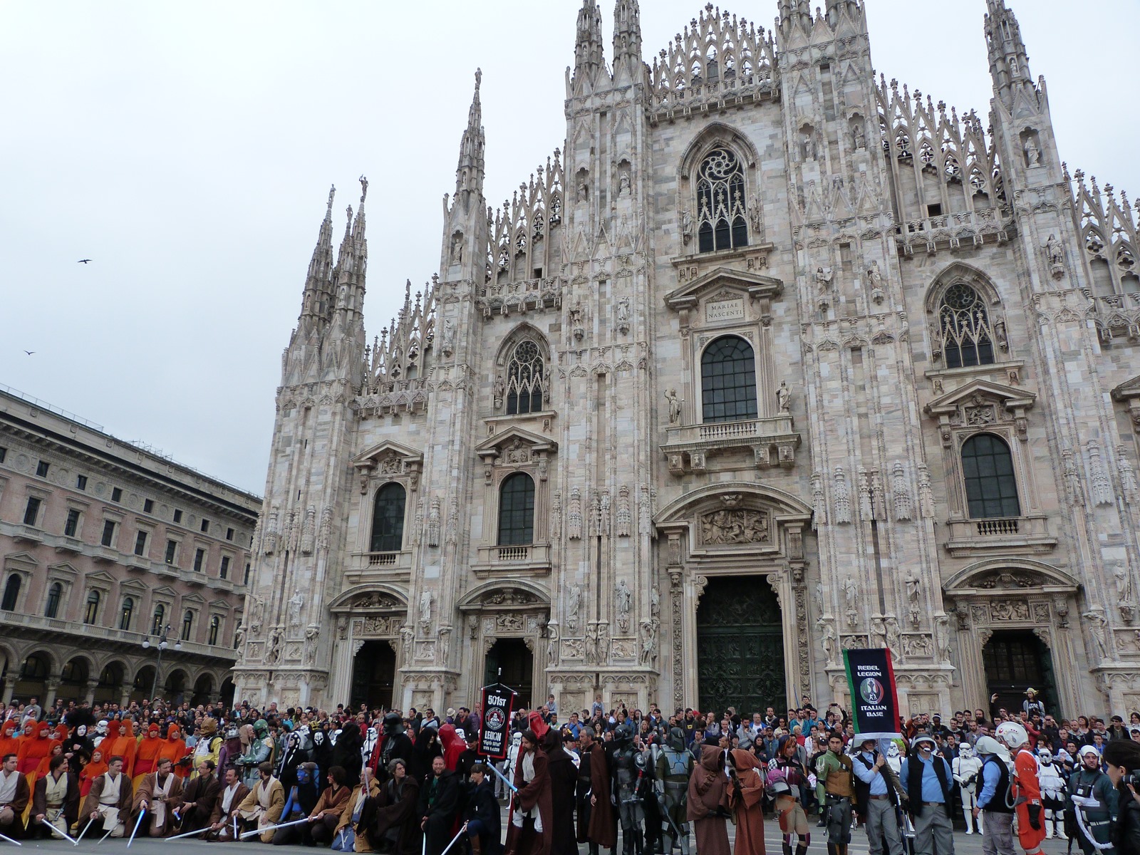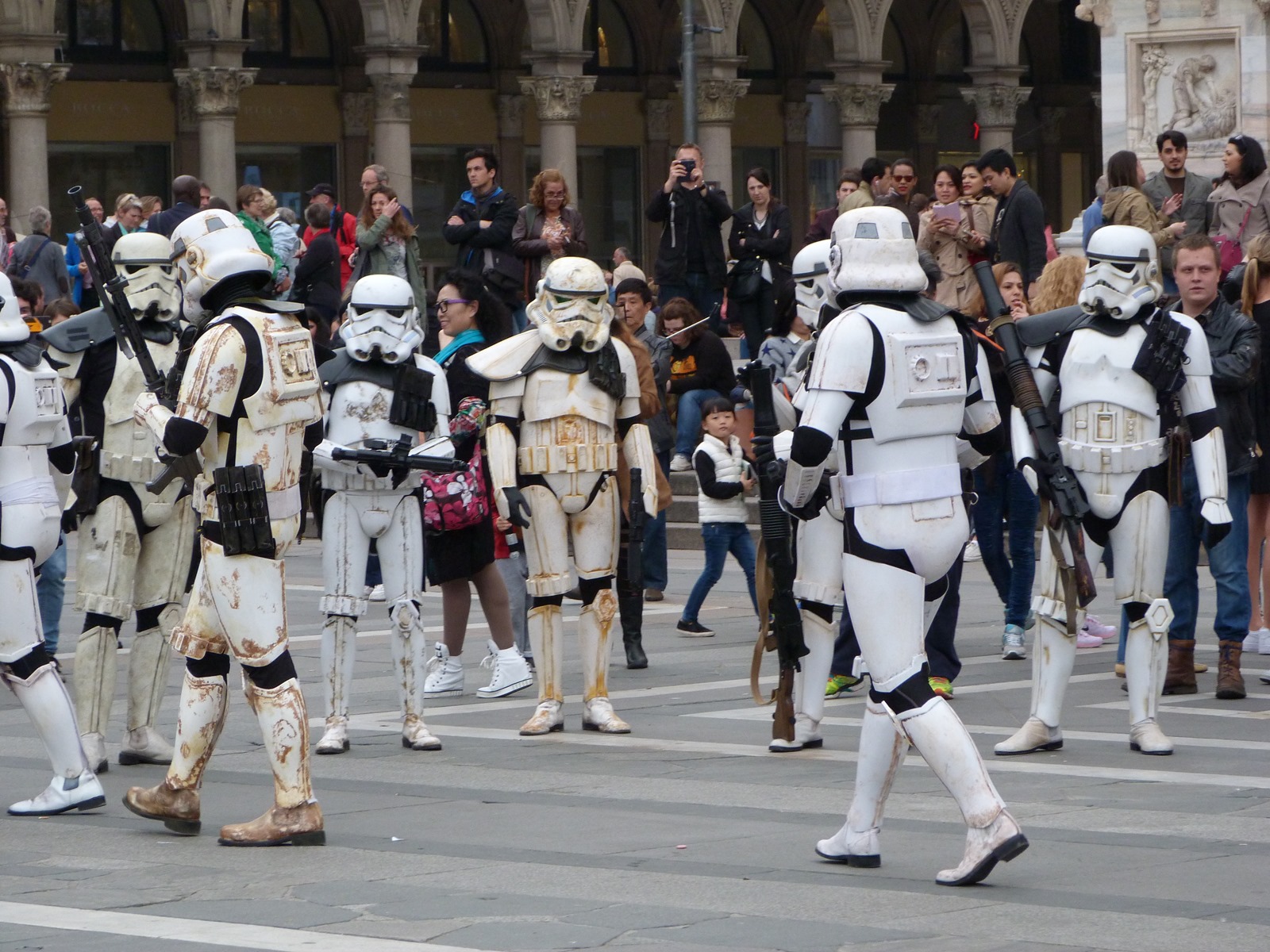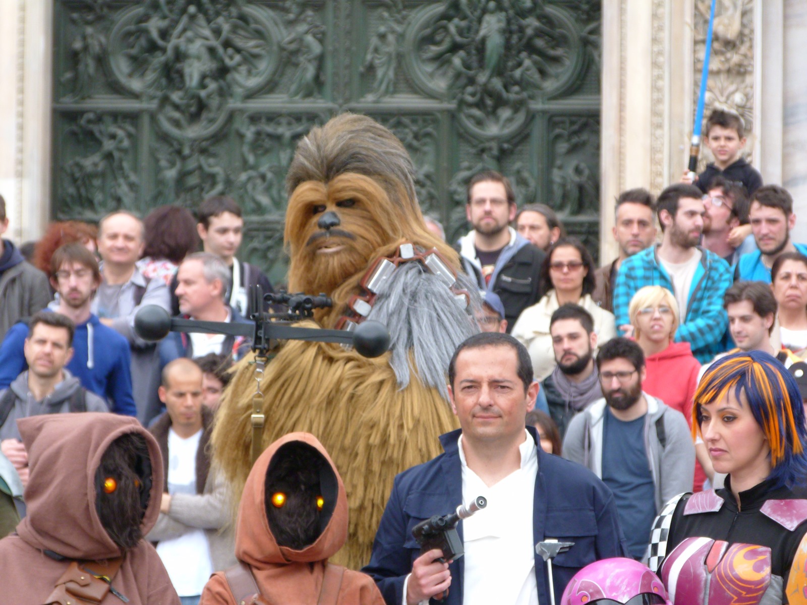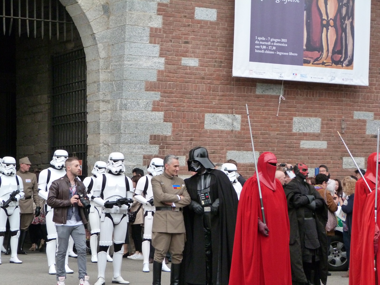 All'arrivo in piazza Duomo erano già innumerevoli i fan di tutte le età in attesa di vedere da vicino i propri personaggi preferiti e le prime spade laser si facevano già intravedere in mano a tanti bambini, ma non solo, mentre gli stormtrooper attendevano l'apparizione dalla Terrazza Mondadori di Darth Vader che ha salutato dall'alto.