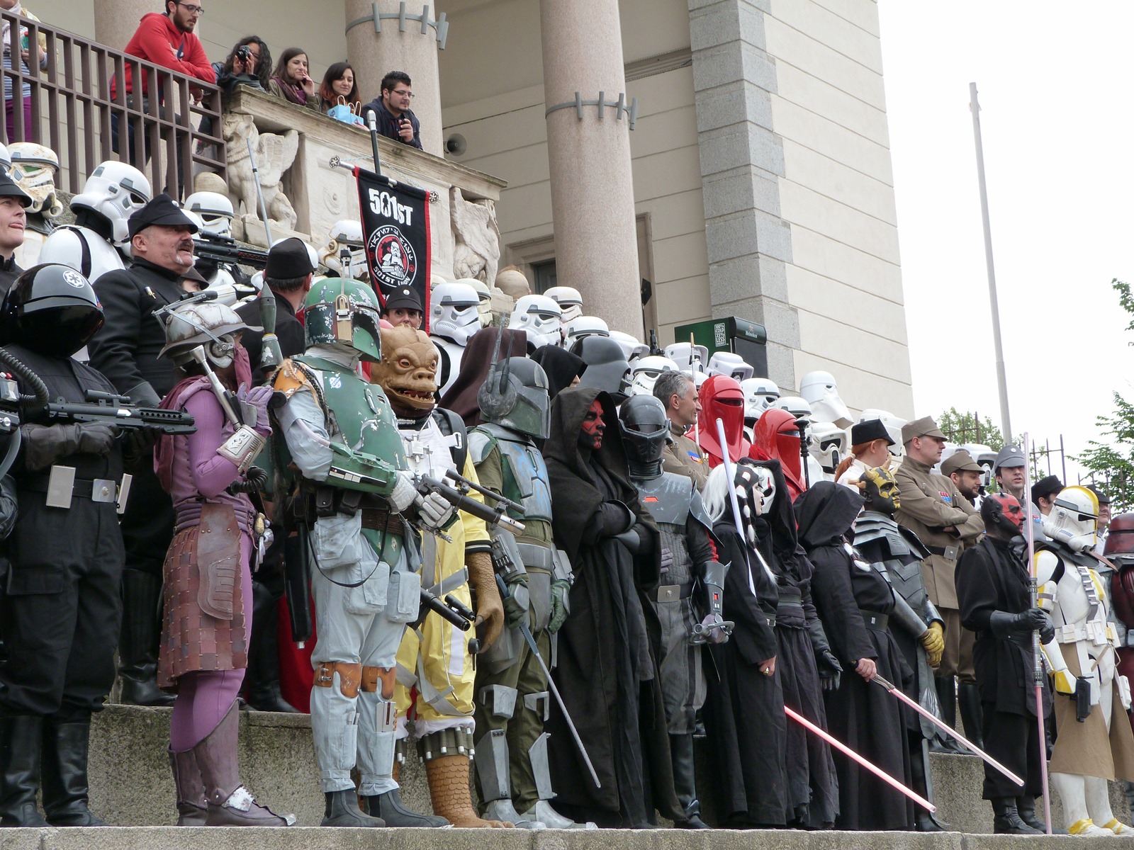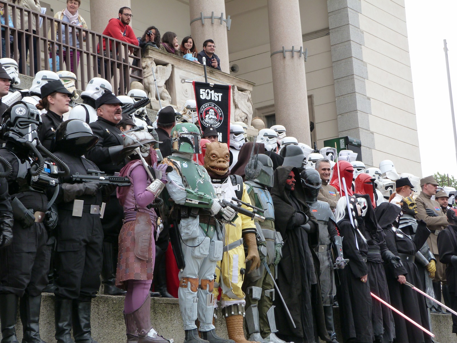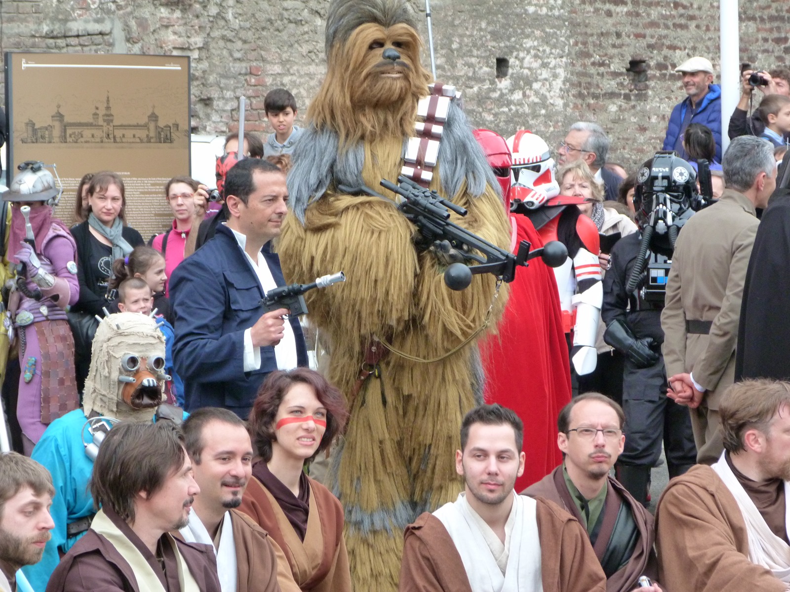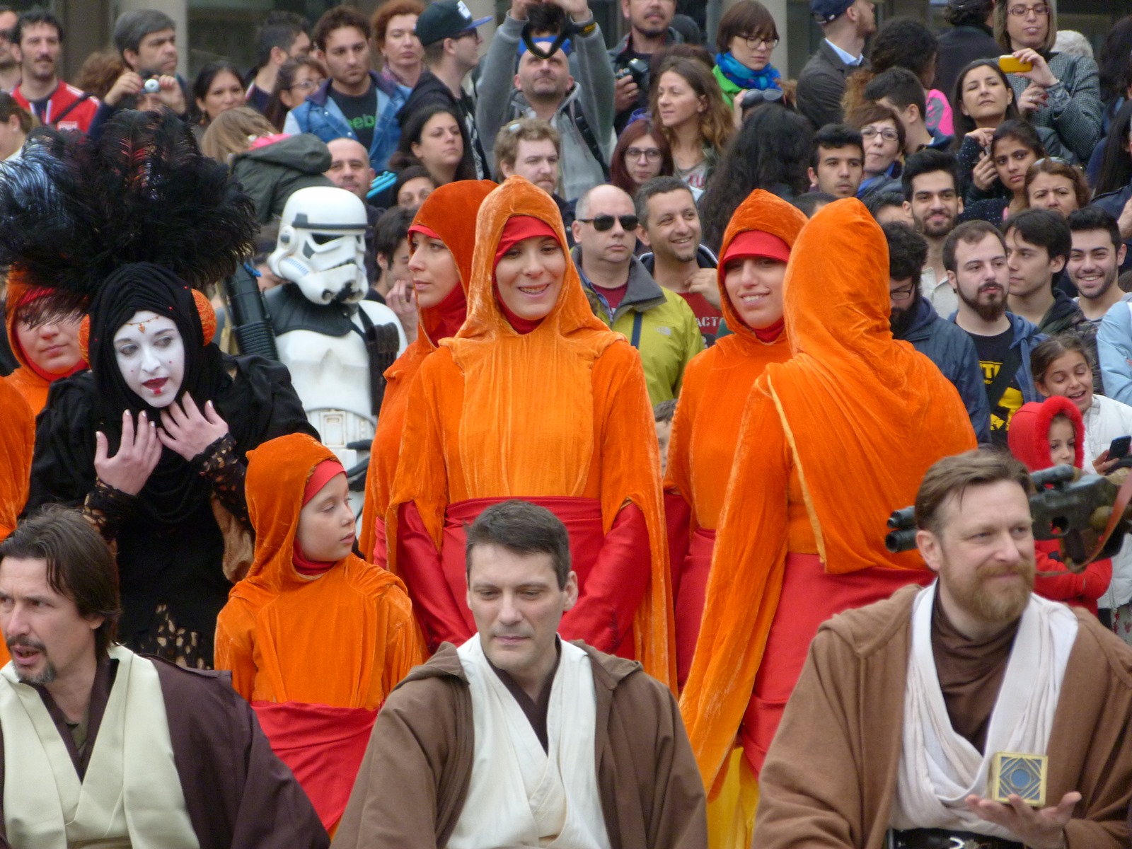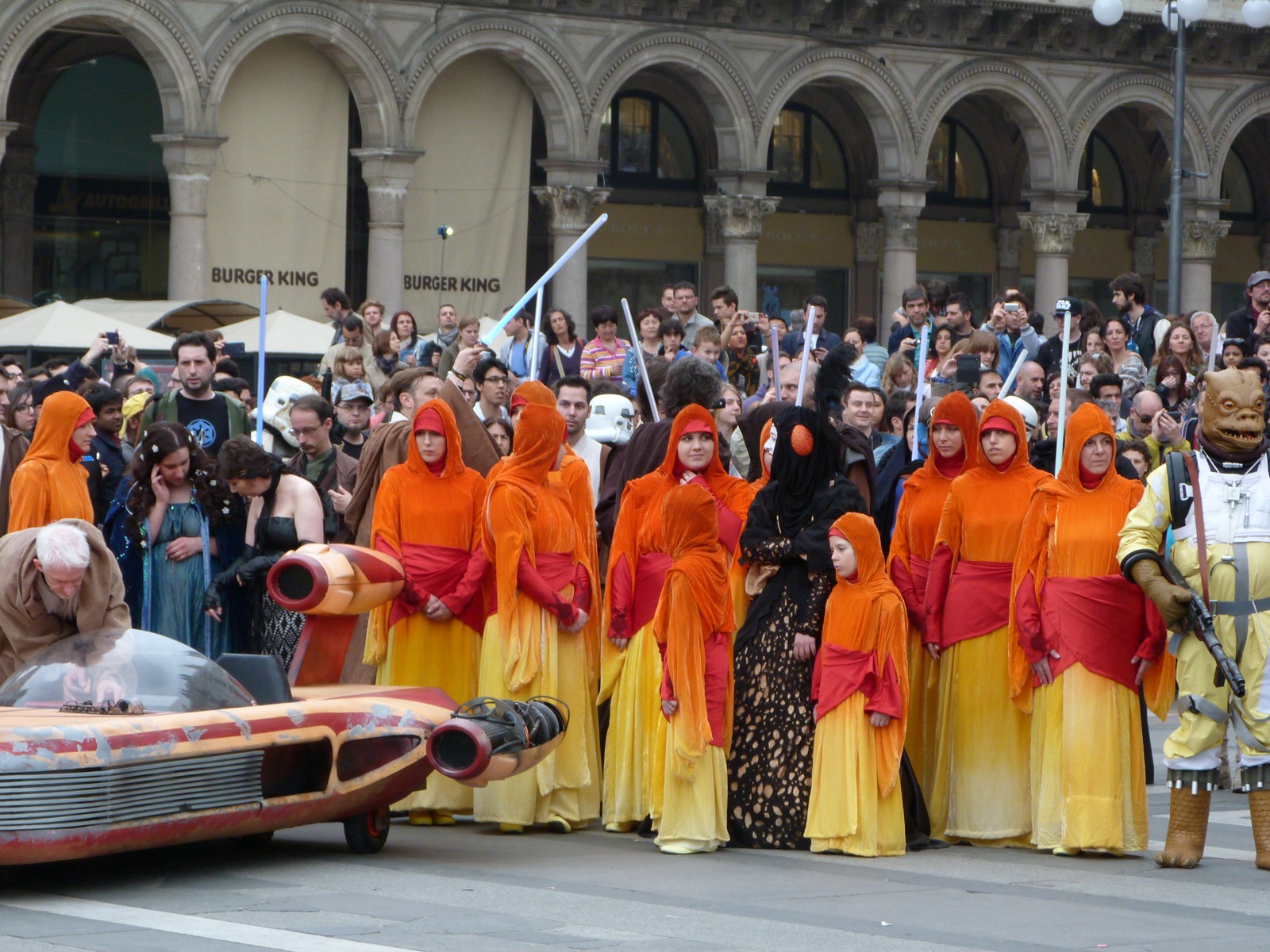 All'arrivo in piazza Duomo erano già innumerevoli i fan di tutte le età in attesa di vedere da vicino i propri personaggi preferiti e le prime spade laser si facevano già intravedere in mano a tanti bambini, ma non solo, mentre gli stormtrooper attendevano l'apparizione dalla Terrazza Mondadori di Darth Vader che ha salutato dall'alto.
